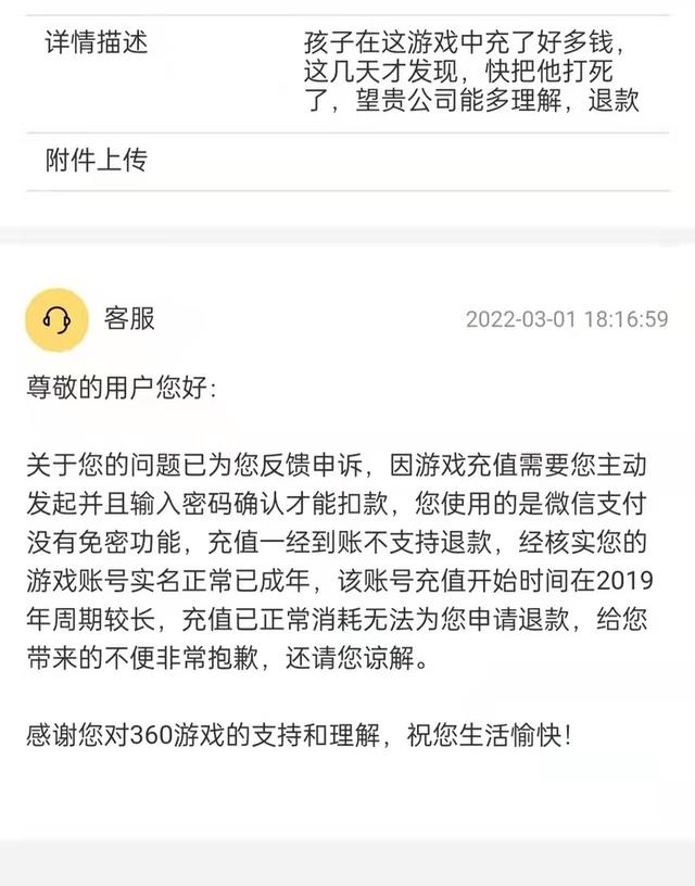 據(jù)王先生介紹,他跟360游戲申請退款的過程并不順暢,使用普通手機(jī)號撥打360游戲客服電話,都是智能語音回復(fù),沒有辦法反饋具體問題。只有360游戲賬號達(dá)到VIP2級別的用戶,必須使用綁定的手機(jī)號撥打,才有人工客服反饋。王先生協(xié)助其父母按360游戲的要求提供了相關(guān)資料,最終360游戲答復(fù)無法退款。據(jù)360游戲表示,“因游戲充值需要您主動發(fā)起并且輸入密碼確認(rèn)才能扣款,您使用的是微信支付沒有免密功能,充值一經(jīng)到賬不支持退款,經(jīng)核實您的游戲賬號實名正常已成年,該賬號充值開始時間在2019年周期較長,充值已正常消耗無法為您申請退款”。新黃河記者就此郵件咨詢360游戲,其官方客服表示,需要填寫相關(guān)表單或者通過郵件方式核實相關(guān)問題。