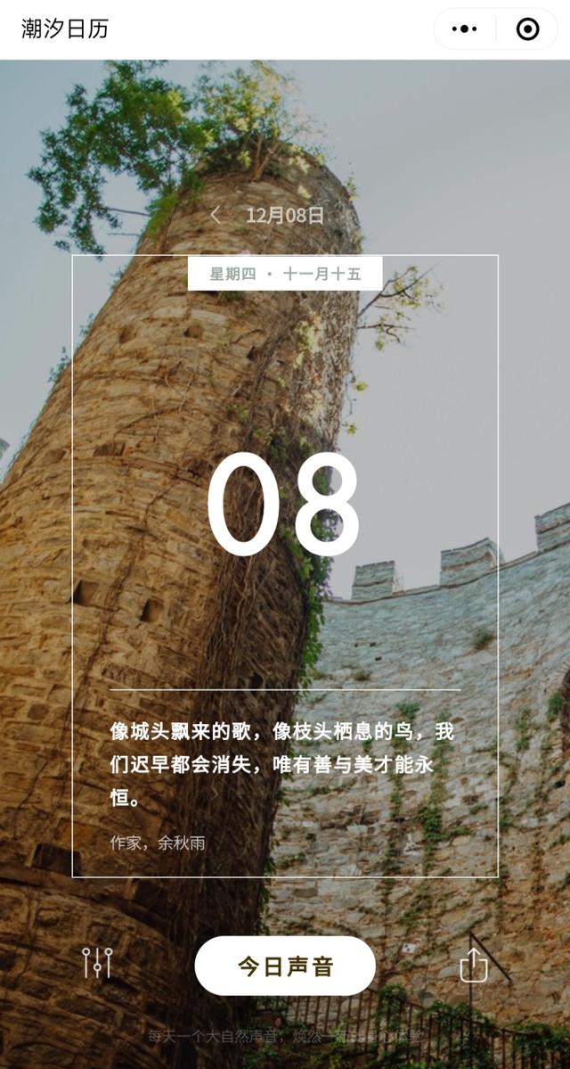 潮汐日歷是一款可以被聽見的日歷小程序,每天一句格言,一張優(yōu)美圖片,一段大自然聲音,帶給你一個平靜身心的美好時刻,放松身心~