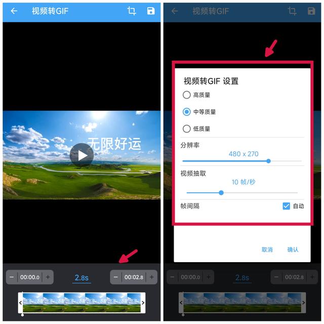 步驟三:“參數(shù)設置”主要分為,裁剪視頻畫面和時長,這會直接影響gif動圖的內容和大小,一段長視頻中,一般截取3秒左右的精彩畫面即可,畫面越小,gif動圖尺寸也就越?。?/p>