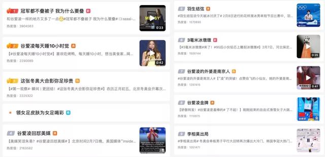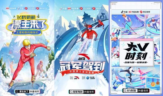 就在央、咪、快、騰以版權(quán)優(yōu)勢(shì)滿足人們視頻化觀賽需求時(shí),無版權(quán)的平臺(tái)們也在想方設(shè)法抓冬奧熱點(diǎn),如微博用熱搜榜和明星號(hào)承接人們實(shí)時(shí)觀賽的群體情緒,掀圖文社交高潮;抖音發(fā)動(dòng)谷愛凌、武大靖等冠軍天團(tuán)入駐,望以運(yùn)動(dòng)明星為基點(diǎn)孵化多元冬奧內(nèi)容。