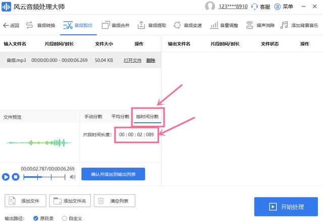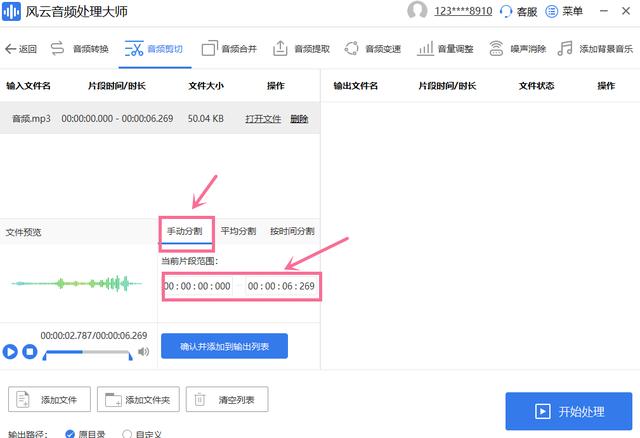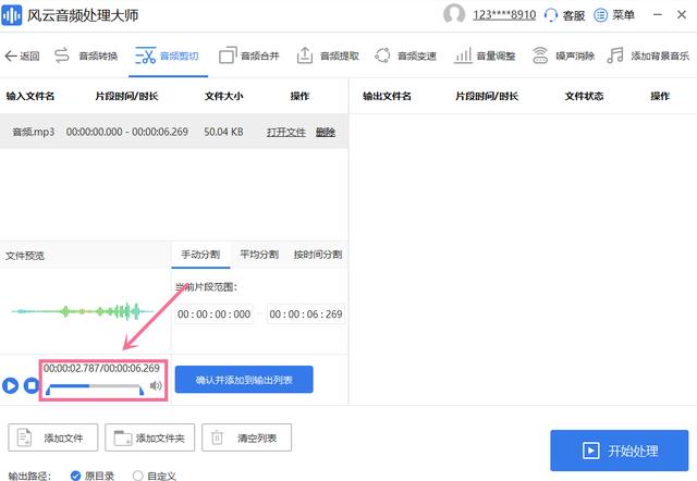 操作完畢后,你可以自定義選擇剪輯好的音頻的存放位置,當然,嫌麻煩的話也可以不自定義,軟件會默認將音頻存到原音頻的相同目錄中,點擊一下“確認并添加到輸出列表”按鈕,將音頻導入右邊的列表,然后按下“開始處理”。