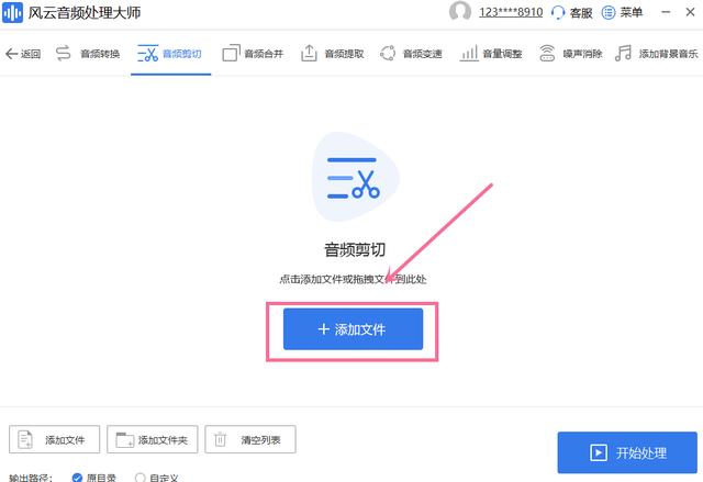 主界面中有八個功能,選擇“音樂剪輯”,點擊進入操作界面,正中間清晰可見“添加文件”按鈕,點擊按鈕,找到音頻素材的存放位置,將其添加進來。