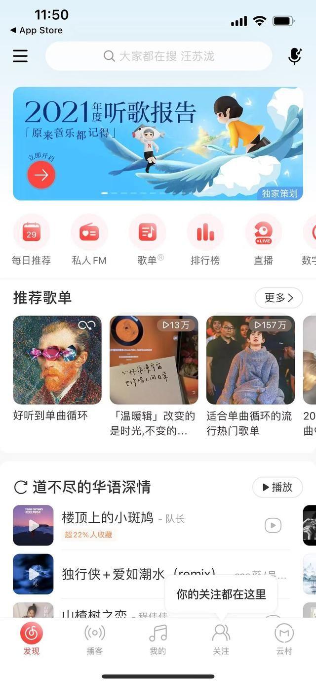 打開之后,會有一系列的推薦歌單,和活動banner。在搜索欄也有搜索底紋詞對用戶做引導(dǎo)提示。關(guān)注頁面有文字提醒,吸引用戶的點擊。